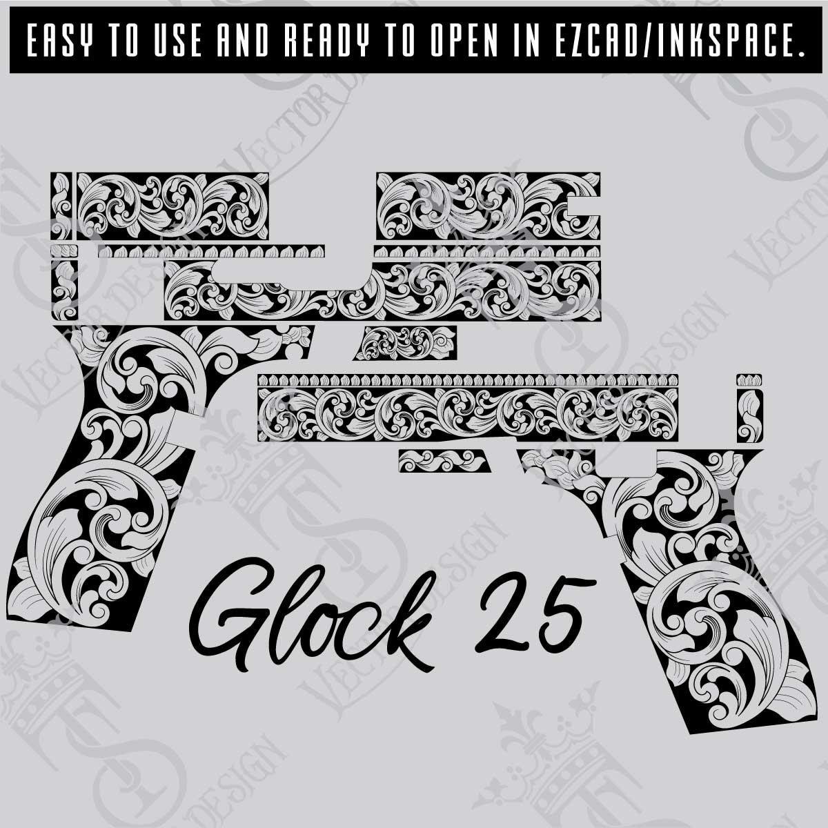 STVector Design This Glock 25 Scroll Vector Design suitable for all the cutting machines like Vinyl cut, Cricut, CNC machines (Shapeoko, XCarve, etc) and laser engraving machines! This file is perfect for making stickers, Gun engravings, carving or toolpaths for CAM and CAD programs. Please feel free to reach us out if you are having any kind of issues with these files when you are Engraving.
